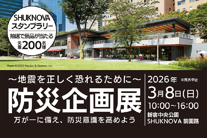 2026年3月8日(日)に新宿中央公園SHUKUNOVA前園路で開催される「防災企画展」に出展いたします。